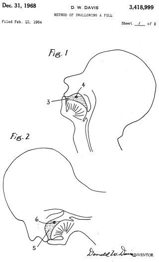 1. The method of swallowing a pill by a human subject which comprises the steps of taking a single swallowable amount of a liquid in the mouth together with a pill having a density in the range from about 0.4 to about 0.95, and a volume in the range from about 0.2 cubic centimeters to about 1.7 cubic centimeters, as shown by the shaded area 50 of FIGURE 3, then bowing the head downwardly and forwardly while retaining said liquid and pill in the mouth, and then swallowing same while the head is held in said downwardly bowed position.